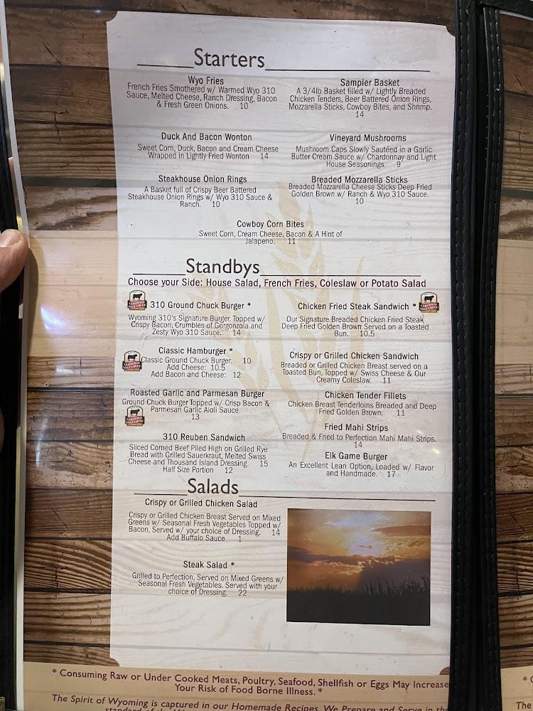 Wyoming 310 has a diverse menu featuring around 35 dishes, each crafted to please. Diners can choose from appetizers like the Sampler Basket and Steakhouse Onion Rings, perfect for sharing.